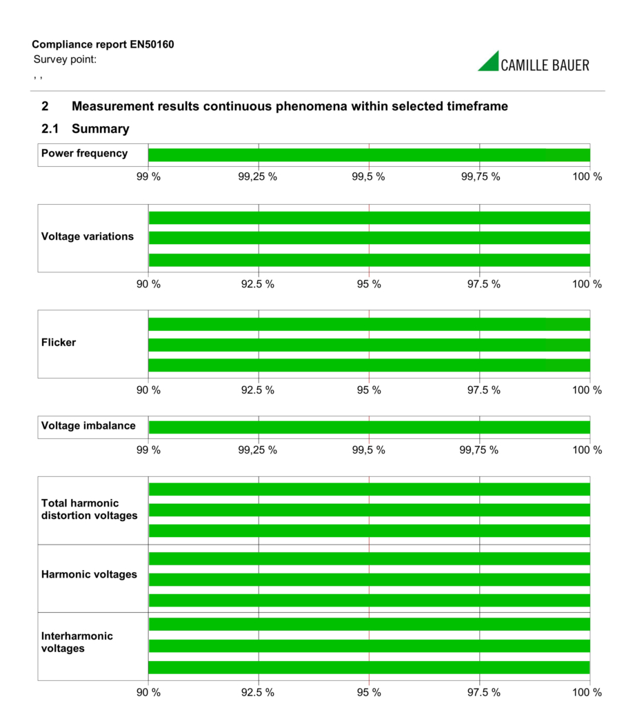 Standards such as EN50160 (Europe), IEEE519 (US), GB/T (China), etc. can be used to prepare conformity assessments. A statistical minimum period of 7 days should not be underrun when generating the ratings. As a rule, the evaluations are then issued in a report form, whereby the format of the report is not subject to any standard.